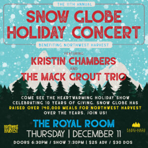 Snow Globe Concert 2025 Spark hope by joining us at the 11th Annual Snow Globe Concert benefiting Northwest Harvest December 11 at 7:30 PM. 11 Dec 7:30 pm - 11:00 pm